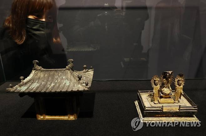 (서울=연합뉴스) 이재희 기자 = 17일 오전 서울 강남구 케이옥션에서 국보 '금동삼존불감'을 전시하고 있다. 간송미술관이 소장하고 있는 이 국보는 오는 27일 열리는 올해 첫 메이저 경매에 출품될 예정이다. 2022.1.17