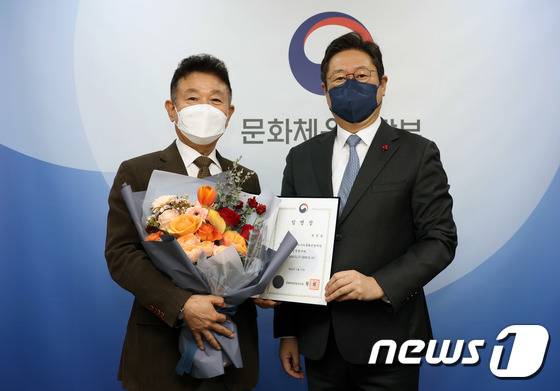 (서울=뉴스1) = 황희 문화체육관광부 장관(오른쪽)이 17일 서울 용산구 문체부 저작권보호과 서울사무소에서 최영준 신임 국립아시아문화전당재단 이사장에게 임명장을 수여한 뒤 기념촬영을 하고 있다. (문화체육관광부 제공) 2022.1.17/뉴스1