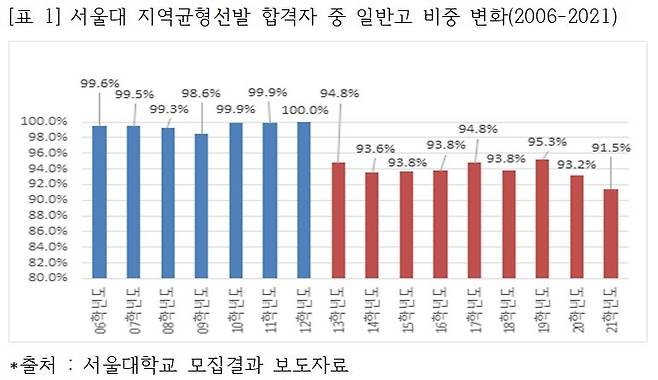 만일 서울대가 지역균형을 학종으로 변경하지 않고 이전과 같이 1단계에서 내신성적 100%로 선발했다면 일반고의 합격자 비중은 94.2% 수준이 아니라 99.5% 수준을 유지했을 것이다.