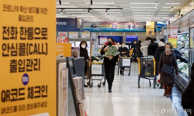 정부가 내일부터 전국의 대형마트·백화점·보습학원·독서실·박물관·영화관 등 코로나19 감염 전파 위험이 적은 시설의 방역패스 적용 해제를 발표한 17일 서울 한 대형마트에서 시민들이 장을 보고 있다.