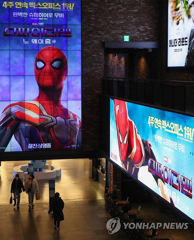 (서울=연합뉴스) 류효림 기자 = '스파이더맨:노 웨이 홈'이 새로 개봉한 한국 영화와 할리우드 거장들의 작품들을 제치고 5주 연속 주말 박스오피스 정상을 지켰다. 17일 영화진흥위원회 영화관입장권 통합전산망에 따르면 '스파이더맨'은 지난 주말 사흘(14∼16일) 동안 17만1천여명(매출액 점유율 24.8%)의 관객을 모으며 1위를 차지했다. 사진은 이날 서울 시내 영화관에 스파이더맨 홍보 영상 모습. 2022.1.17