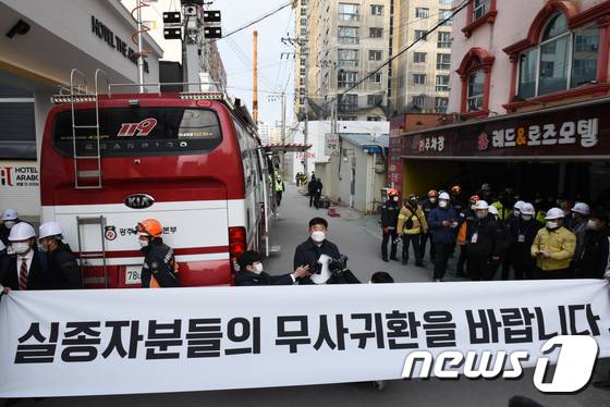 (광주=뉴스1) 김동수 기자 = 이승엽 광주 서구 화정아이파크 예비 입주자 협의회 대표가 17일 붕괴사고 현장을 찾아 정몽규 현대산업개발 회장의 사퇴를 규탄하는 성명서를 발표하고 있다.2022.1.17/뉴스1