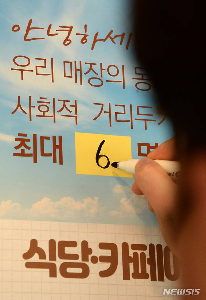 [전주=뉴시스] 김얼 기자 = 정부의 사회적거리두기 조정방안에 따른 사적 모임 최대 인원이 6인으로 완화된 17일 전북 전주시의 한 카페에서 관계자가 안내문을 수정하고 있다. 2022.01.17. pmkeul@nwsis.com