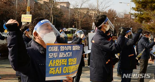 [전주=뉴시스] 김얼 기자 = 전국택배노동조합 우체국 투쟁본부 조합원들이 17일 전북 전주시 전북지방우정청 앞에서 전국택배노조 무기한 상경투쟁 선포 기자회견을 열고 구호를 외치고 있다. 2022.01.17. pmkeul@nwsis.com