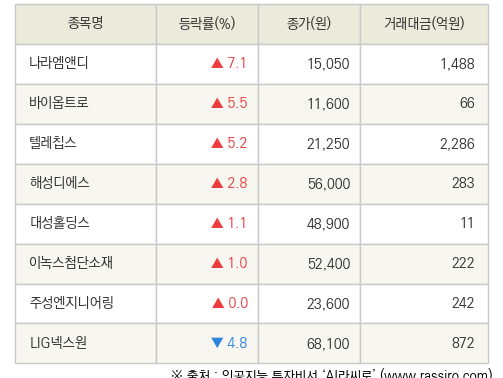 특히 나라엠앤디는 전 거래일 대비 7.1% 오른 15,050원에 거래를 마감하여 높은 관심을 받았다.