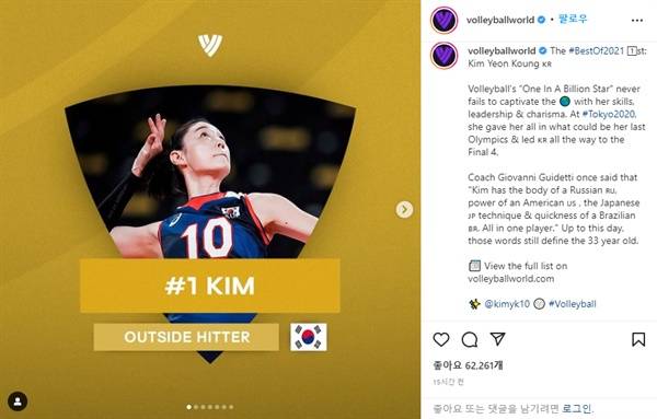 | ▲ 발리볼월드닷컴 공식 소셜미디어는 2021년 세계 최고 여자배구 선수로 김연경이 선정됐다고 발표했다. |