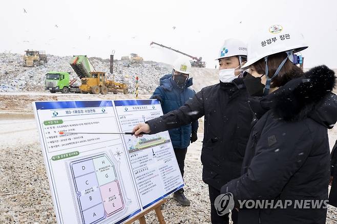 (서울=연합뉴스) 한정애 환경부 장관(왼쪽)이 17일 오후 인천광역시 서구 소재 수도권매립지 폐기물처리 현장을 방문해 사업 현황 보고를 받고 있다. 2022.1.17 [환경부 제공. 재판매 및 DB 금지]