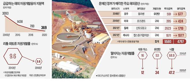 이에 따라 광물확보 담당 공기업인 한국광물자원공사(현 한국광해광업공단)는 2018년부터 지난해까지 호주 물라벤 유연탄 광산, 미국 로즈몬트 구리광산, 칠레 산토도밍고 구리광산 등 3개 광산과 캐나다 자원 개발 업체인 캡스톤의 지분을 전량 매각했다. 4개 해외자산 매각 금액은 처분 당시 환율 기준 약 4800억원으로, 누적 투자금액 약 5600억원보다 14%가량 적다.