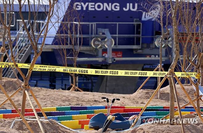 (경주=연합뉴스) 손대성 기자 = 17일 경북 경주시 신평동 보문관광단지 내에 있는 경주루지월드 사고지점 주변에 경찰의 출입통제선이 설치돼 있다.