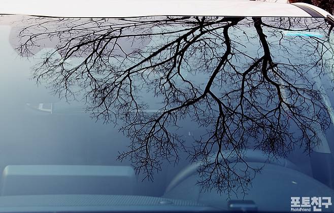 저녁 무렵 앙상한 겨울나무 실루엣이 자동차에 비친 모습입니다.