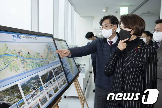 (서울=뉴스1) = 한정애 환경부 장관이 17일 오후 경기도 김포시에 위치한 수자원환경산업진흥을 방문해 관계자로부터 경인아라뱃길 현황을 설명듣고 있다. (환경부 제공)2022.1.17/뉴스1