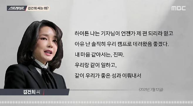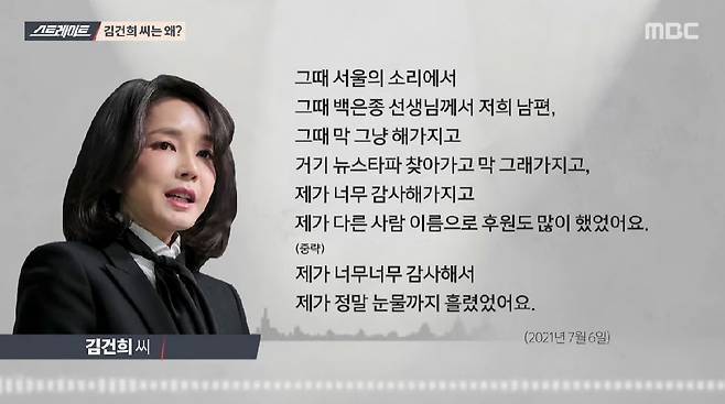 | ▲ MBC 시사프로그램 <스트레이트>가 16일 방송한 윤석열 국민의힘 대선후보의 부인 김건희씨와 <서울의소리> 이명수 기자와의 통화 내용. |