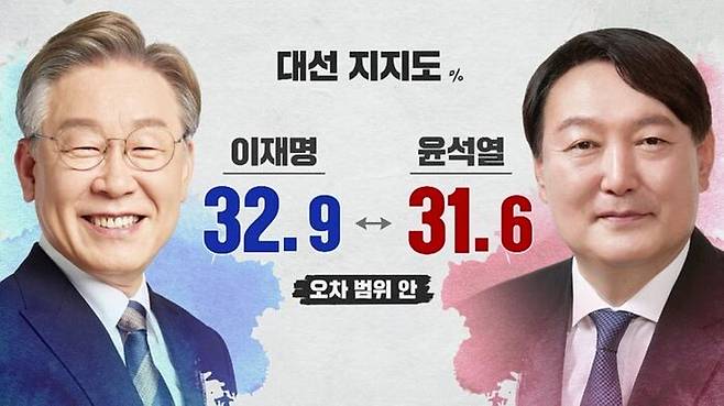 민주당 이재명 32.9, 국민의힘 윤석열 후보 31.6%, 격차는 1.3% 포인트, 오차 범위 안입니다.