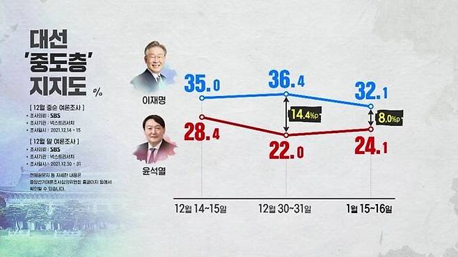 이념 성향별로는 '캐스팅보트'로 평가받는 중도층에서, 이 후보는 4.3%포인트 떨어지고, 윤 후보는 2.1%포인트 올라 이 후보 우세는 유지하면서도 격차는 한 자릿수로 좁혀졌습니다.