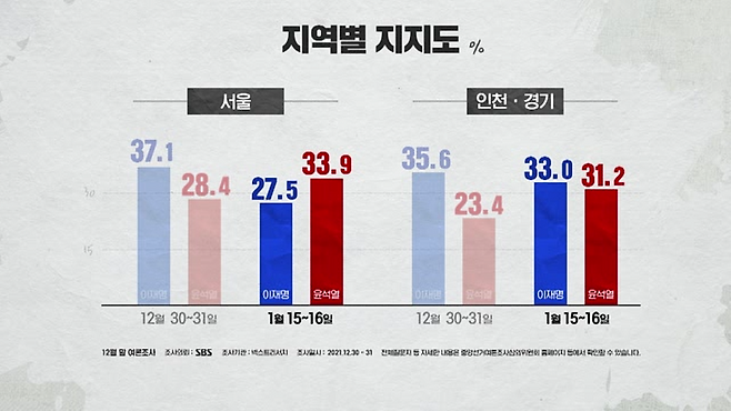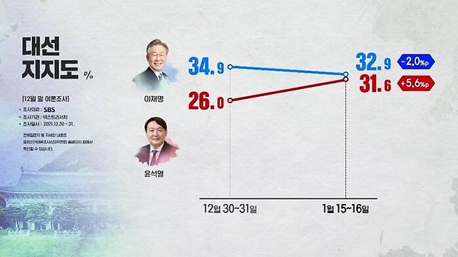지난달 말 SBS 여론조사와 비교해보니 이 후보는 2%포인트 떨어졌고, 윤 후보는 5.6%포인트 올랐습니다.