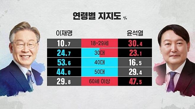 이재명, 윤석열 후보의 지지층을 연령대별로 분석해 보면, 이 후보는 40·50대에서, 윤 후보는 20대 이하와 60세 이상에서 더 많은 지지를 받았습니다.