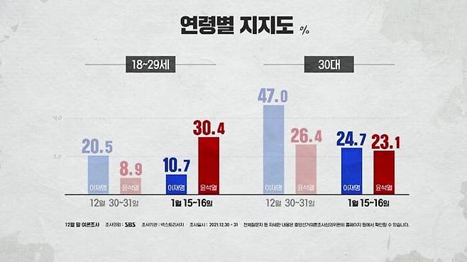 지난달 말 조사에서 이 후보 지지세가 강했던 20대와 30대가 각각 '윤 후보 지지'와 '박빙'으로 돌아선 게 눈에 띕니다.