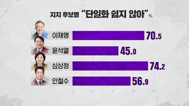 윤석열, 안철수 후보 지지자들에 비해 이재명 후보 지지자들이 단일화 불발 가능성을 더 크게 내다봤습니다.
