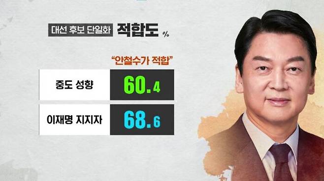 중도층에서도 60.4%가 안 후보를 꼽았고 응답 표본수가 가장 많은 이재명 민주당 후보 지지자들의 68.6%가 안 후보의 손을 들었습니다.