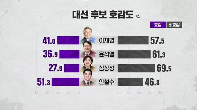후보별 호감도는 안철수 후보가 유일하게 50%를 넘었고 이재명, 윤석열, 심상정 순이었습니다.