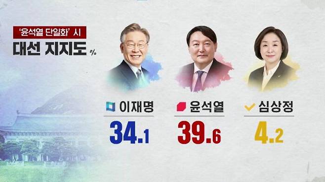 윤 후보가 단일 후보가 되면 오차범위 내 이재명 후보와 경합이었고,