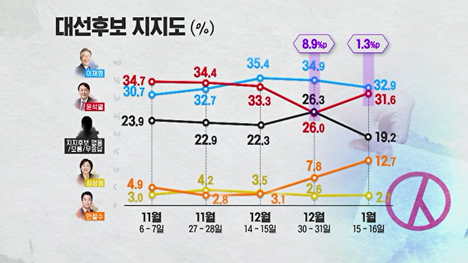 대선후보 지지도, 보름 전 조사에서 양강 후보 간에 '골든, 데스크로스'가 발생했는데, 이번에는 이재명 후보가 내리고, 윤석열 후보가 오르며, 그 격차가 8.9%포인트에서 1.3%포인트까지 줄어들었습니다.