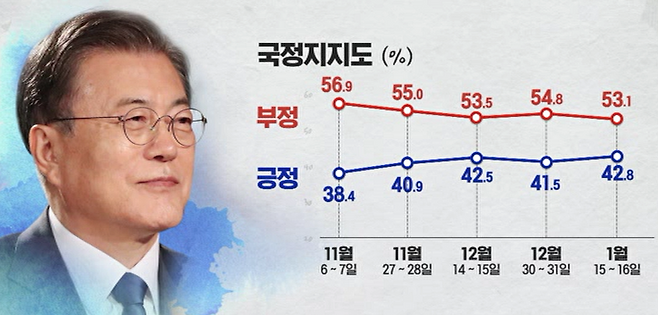 '잘하고 있다'라는 긍정 응답, 잘못하고 있다는 부정 응답이 큰 출렁임 없이, 긍정은 40% 초반, 부정은 50% 초반을 유지하고 있습니다.