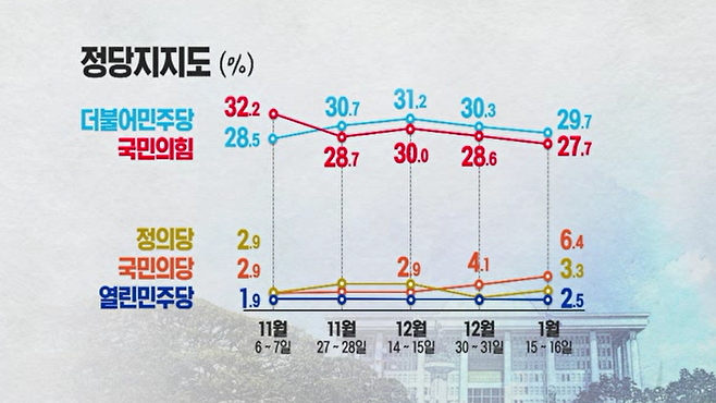 더불어민주당과 국민의힘 모두 두 차례 연속 떨어지면서 각각 29.7, 27.7%를 기록했습니다.