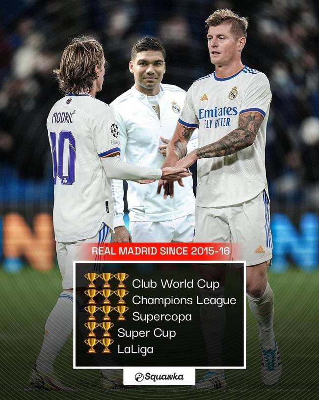 이들이 얻은 트로피 개수만 13개다. 축구 통계 매체 '스쿼카'는 2015년부터 갖춰진 '크카모'의 업적을 공개했다. 유럽축구연맹(UEFA) 챔피언스리그(UCL) 3연패뿐만 아니라 스페인 라리가 2회, 국제축구연맹(FIFA) 클럽 월드컵 3회, UEFA 유럽 슈퍼컵 2회, 스페인 슈퍼컵 2회를 들어 올렸다.