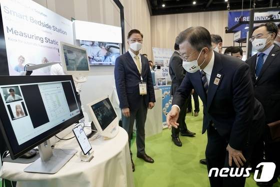 (서울=뉴스1) = 문재인 대통령이 17일 오전(현지시간) 두바이 엑스포 전시센터에서 열린 2022 두바이 한국 우수상품전에서 전시품을 관람하고 있다. (청와대 제공)2022.1.18/뉴스1