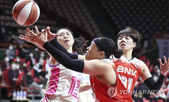 (부산=연합뉴스) 강덕철 기자 = 17일 부산 사직실내체육관에서 열린 여자프로농구 BNK 썸과 삼성생명 블루밍스의 경기·BNK 김한별과 삼성생명 김단비가 리바운드를 다투고 있다. 2022.1.17