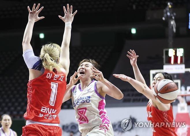 (부산=연합뉴스) 강덕철 기자 = 17일 부산 사직실내체육관에서 열린 여자프로농구 BNK 썸과 삼성생명 블루밍스의 경기. 삼성생명 이주연 공격이 BNK 압박 수비에 고전하고 있다 2022.1.17