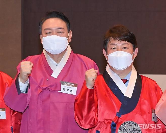 [대구=뉴시스] 정창오 기자=권영진 대구시장과 윤석열 국민의힘 대통령선거 후보가 17일 오후 서울 한국프레스센터 국제회의장에서 열린 2022년 재경대구경북인 신년교례회에서 화이팅 포즈를 취하고 있다.(사진=대구시 제공) 2022.01.17. photo@newsis.com