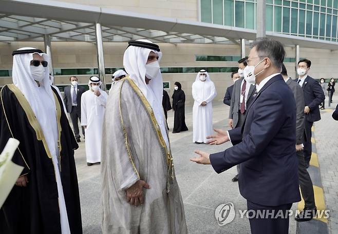 (라스알카이마=연합뉴스) 서명곤 기자 = 문재인 대통령이 17일(현지시간) 아랍에미리트(UAE) 셰이크칼리파 전문병원을 방문, 셰이크 사우드 빈 싸끄르 알 까시미 라스알카이마 지역 통치자와 인사하고 있다. 이 병원은 2014년부터 서울대병원이 위탁 중인 곳으로, 외국의 대형 3차 의료기관을 한국이 위탁 운영하는 첫 사례다. 2022.1.17
