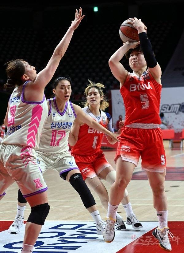 17일 부산 사직실내체육관에서 열린 ‘삼성생명 2021-2022 여자프로농구’ 부산 BNK썸과 용인 삼성생명의 경기에서 BNK썸 안혜지가 삼성생명 이주연의 수비를 피해 슛을 쏘고 있다.