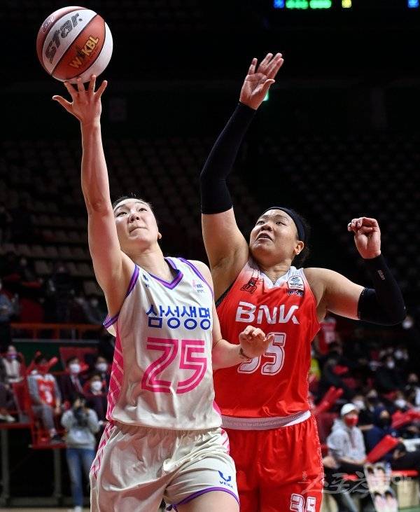 17일 부산 사직실내체육관에서 열린 ‘삼성생명 2021-2022 여자프로농구’ 부산 BNK썸과 용인 삼성생명의 경기에서 삼성생명 배혜윤이 BNK썸 김한별의 수비를 피해 슛을 쏘고 있다.