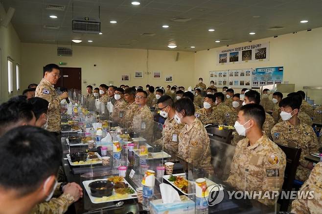 (두바이=연합뉴스) 문재인 대통령과 함께 아랍에미리트(UAE)를 방문 중인 정의용 외교부 장관이 17일(현지시간) UAE에 주둔한 아크부대를 찾아 장병들을 격려하고 있다. 2022.1.17 [아크부대 제공, 재판매 및 DB 금지]