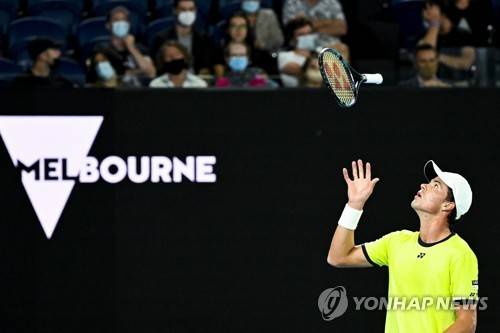 epa09691075 Daniel Altmaier of Germany reacts during his first Round Men's singles match against Alexander Zverev of Germany on Day 1 of the Australian Open tennis tournament, at Melbourne Park, in Melbourne, Australia, 17 January 2022. EPA/DAVE HUNT AUSTRALIA AND NEW ZEALAND OUT