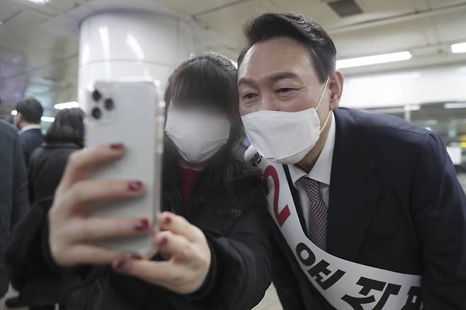 [서울=뉴시스] 최진석 기자 = 윤석열 국민의힘 대선 후보가 17일 저녁 서울 을지로입구역에서 퇴근하는 시민과 셀카를 찍고 있다. (사진=국민의힘 제공) 2022.01.17. photo@newsis.com *재판매 및 DB 금지