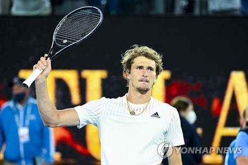 epa09691131 Alexander Zverev of Germany celebrates after winning his first Round Men's singles match against Daniel Altmaier of Germany on Day 1 of the Australian Open tennis tournament, at Melbourne Park, in Melbourne, Australia, 17 January 2022. EPA/DAVE HUNT AUSTRALIA AND NEW ZEALAND OUT