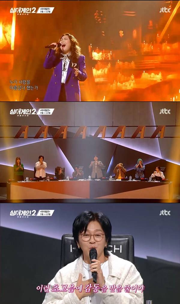 17일 방송된 JTBC 오디션 프로그램 '싱어게인2'에서는 17호 가수의 폭발적인 고음 무대에 심사위원들이 기립박수치는 모습이 그려졌다.
