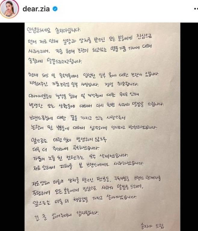 송지아는 “가품이 노출된 콘텐츠는 모두 삭제했다. 나로 인해 피해를 본 브랜드 측에게도 사과하겠다. 나로 인해 마음의 상처를 받으신 팬들, 구독자들 ,브랜드 관계자를 포함해 모든 분에게 진심으로 사과한다. 앞으로는 더욱 더 책임감을 가지고 살아가겠다”고 덧붙였다.