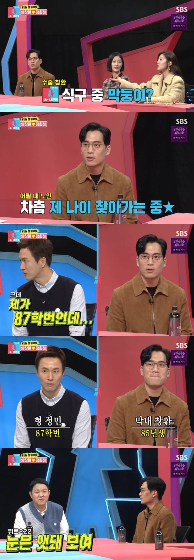 안창환은 “예전에는 노안이라고 했지만 요즘에는 제 나이 같다고 한다”고 말했고, 김정민은 “제가 87학번이다”고 끼어들었다. 출연자들은 모두 “김정민이 너무 동안이다”고 입을 모아 말했다. (사진=SBS ‘동상이몽2 너는 내 운명’ 캡처)