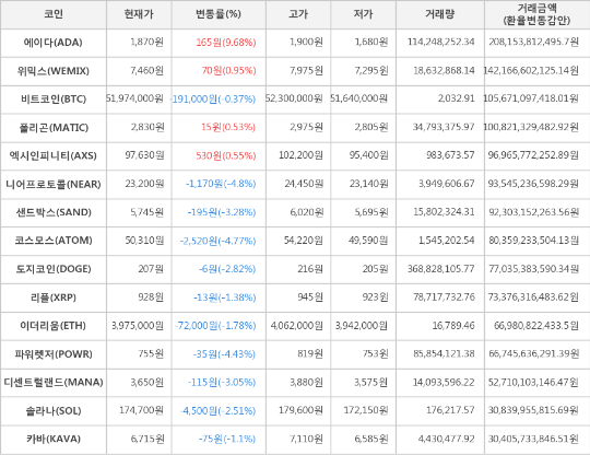 또한, 코스모스(-4.77%, 50,310원), 파워렛저(-4.43%, 755원), 샌드박스(-3.28%, 5,745원), 디센트럴랜드(-3.05%, 3,650원), 도지코인(-2.82%, 207원), 솔라나(-2.51%, 174,700원), 이더리움(-1.78%, 3,975,000원), 리플(-1.38%, 928원), 카바(-1.1%, 6,715원)가 하락세를 나타냈다.