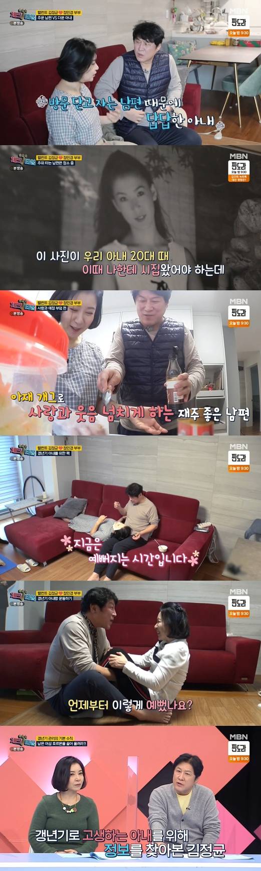 이날 김정균, 정민경 부부의 일상이 공개됐다. 두 사람은 따로 자고 있는 모습으로 눈길을 끌었다. 갱년기로 인해 정민경은 창문을 열고 거실에서 자고 있었던 것.