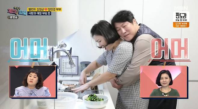 식사를 준비하던 정민경은 시금치를 많이 먹는다며 "갱년기 증상 완화에 시금치가 도움이 된다고 얘기를 많이 들었다"고 말했다. 김정균은 애정표현을 스스럼없이 하며 "나 사랑해 안 해?"라고 물어 눈길을 끌었다.