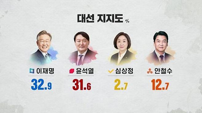 민주당 이재명 32.9, 국민의힘 윤석열 후보 31.6%, 격차는 1.3% 포인트, 오차 범위 안입니다.