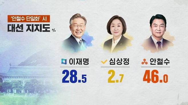 두 후보가 단일화에 성공할 경우 가상대결에서 윤 후보가 단일 후보가 되면 오차범위 내 이재명 후보와 경합이었고, 안 후보가 단일 후보가 되면 오차범위를 넘어, 이 후보를 앞설 걸로 조사됐습니다.