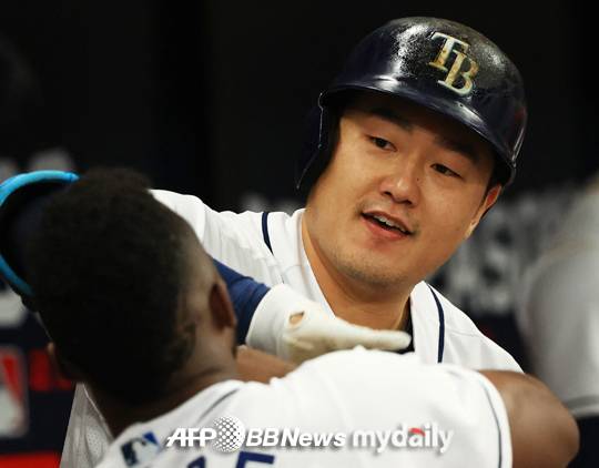 [탬파베이 레이스의 코리안 메이저리거 최지만이 지난 해 보스턴 레드삭스와의 아메리칸리그 디비전시리즈 2차전에서 홈런을 터뜨린 뒤 팀 동료와 기쁨을 나누는 모습이다. 사진 = AFPBBNEWS]- ⓒ마이데일리(www.mydaily.co.kr). 무단전재&재배포 금지 -