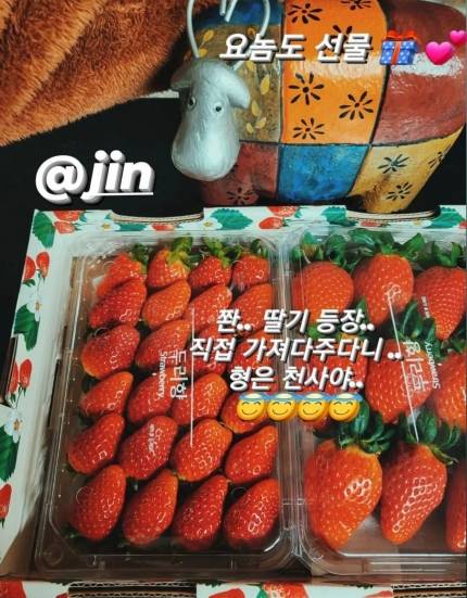 제이홉은 진과 주고받은 DM 메세지 캡처를 인스타그램 스토리에 게시한 후 몇시간 되지 않아 "쫜.. 딸기 등장.. 직접 가져다주다니.. 형은 천사야.."라는 글에 여러명의 천사 이모티콘과 함께 진이 가져다준 딸기 사진을 올렸다.